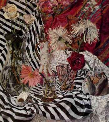 "I like the humor that can occur when objects obscure, interrupt, or contrast with other objects," she adds. In Still Life With Owl Teapot, for example, she was interested in the ways in which the black-and-white striped cloth could be altered through prisms of glass and standing water and repeated in the flowers and fabrics. The rotund, squat teapot, with its quizzical owl eye, is alluded to in the lace pat- |