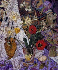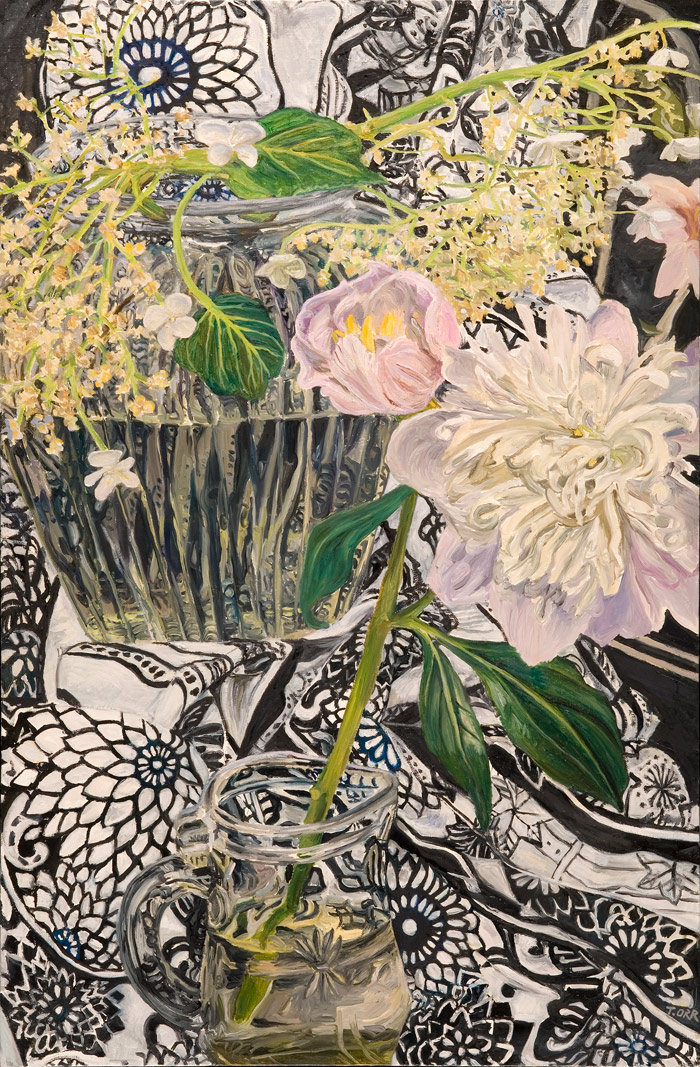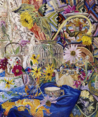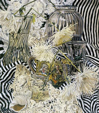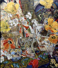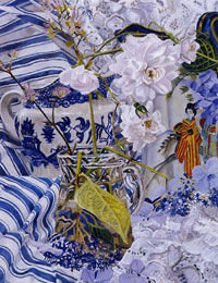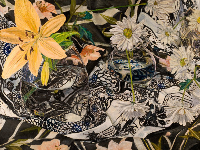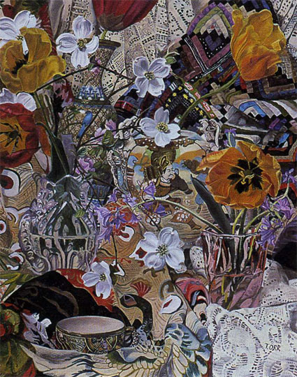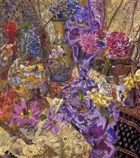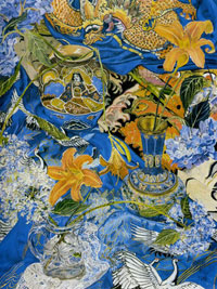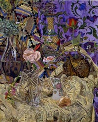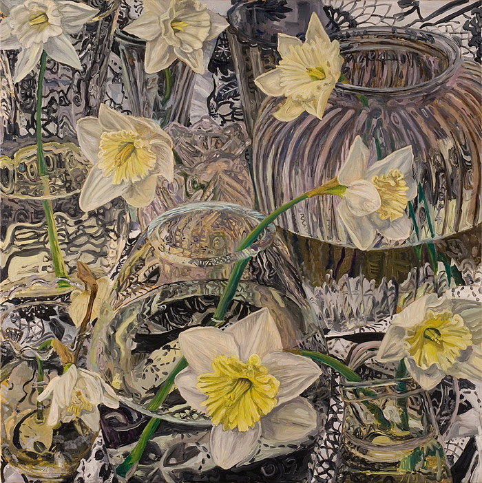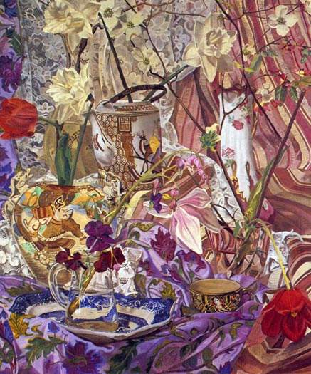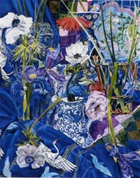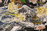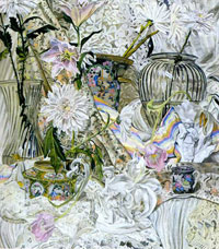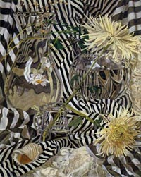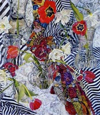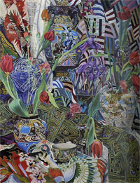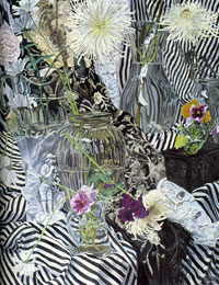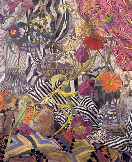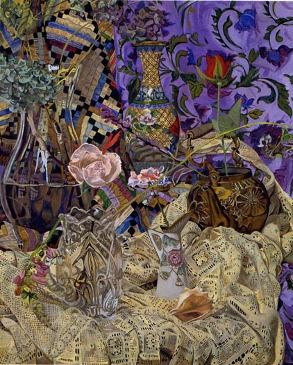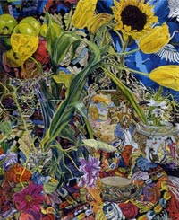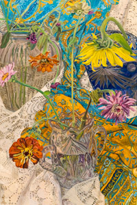 These paintings have to do with my fascination and wonder at looking at things closely, about feeling awe at the lushness and complexity of the visual world, painting the moment of looking that's so complex it initially registers as a jumble of color and pattern, but as the eye focuses, the component parts emerge in absolute clarity.